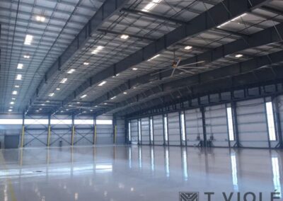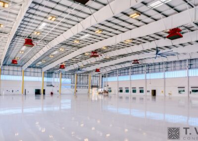 New construction of a 48,500 sq. ft. hangar, 280 ft. clearspan, 55 ft. clear height, with an adjacent 5,800 sq. ft. steel framed office. This project also includes 171,000 sq. ft. of concrete tarmac and 25,000 sq. ft. of parking lot improvements.