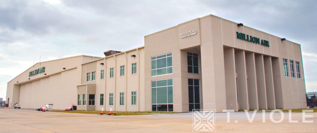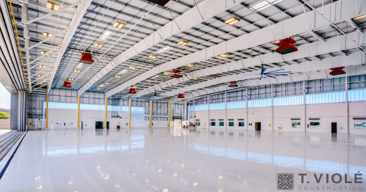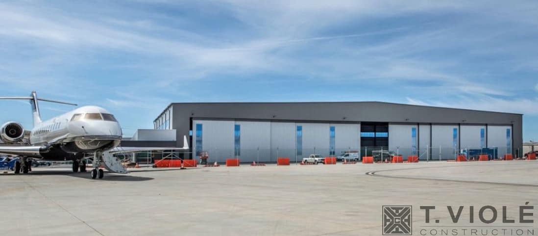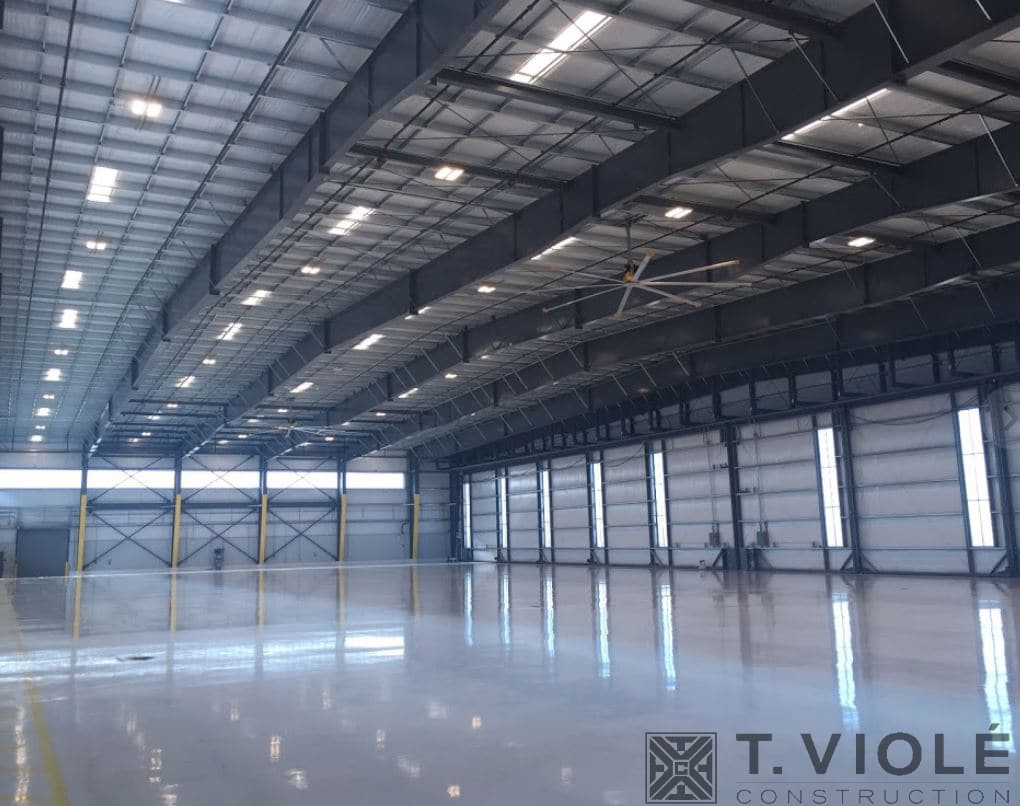 New construction of a 48,500 sq. ft. hangar, 280 ft. clearspan, 55 ft. clear height, with an adjacent 5,800 sq. ft. steel framed office. This project also includes 171,000 sq. ft. of concrete tarmac and 25,000 sq. ft. of parking lot improvements.
