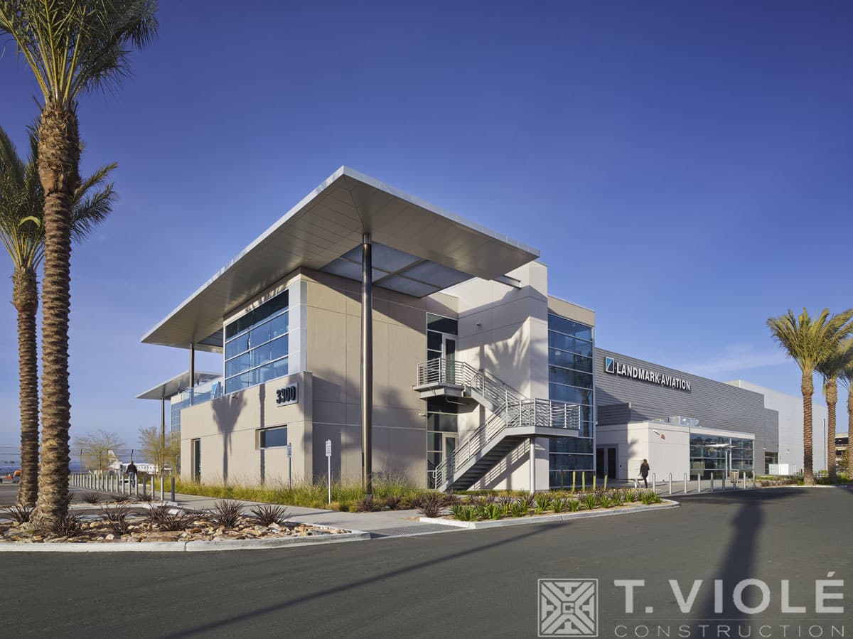 A 5-corporate aircraft hangar complex totaling 120,000 sq. ft. with clear span openings ranging from 160′ to 230′ and full floating hangar doors. A cool roof system includes accommodations for Photovoltaic System.