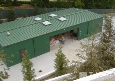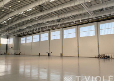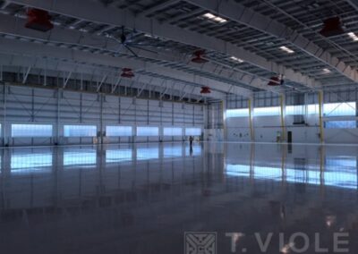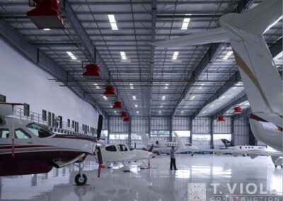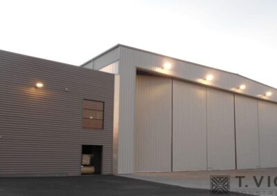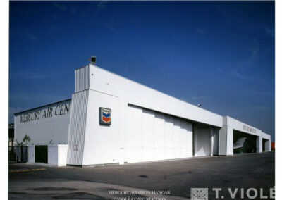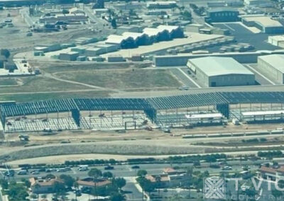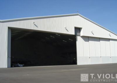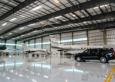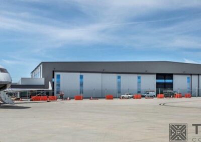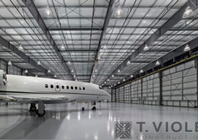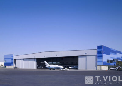 A 5-corporate aircraft hangar complex totaling 120,000 sq. ft. with clear span openings ranging from 160′ to 230′ and full floating hangar doors. A cool roof system includes accommodations for Photovoltaic System.