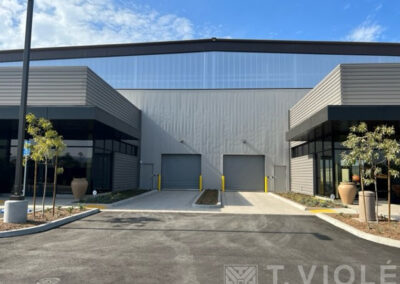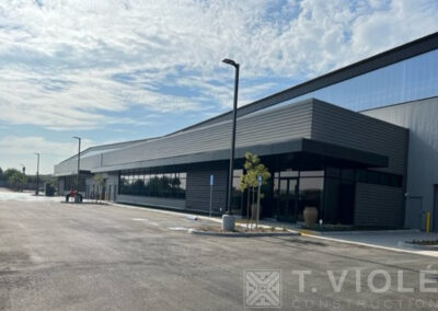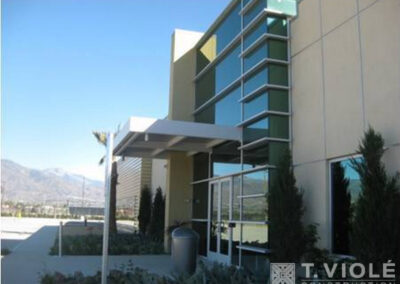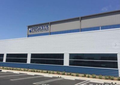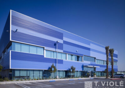 A one and two story office building totaling approximately 58,000 sq. ft. Includes open air patio/garden area on mezzanine level, six large skylight units and tow open wall assemblies covered by aircraft style bifold doors. Natural day lighting achieved with the use of translucent wall and roof panels, two color – exterior single skin PBR wall and roof panels.