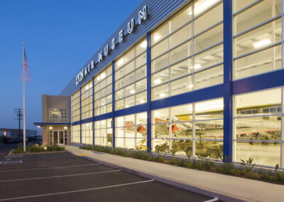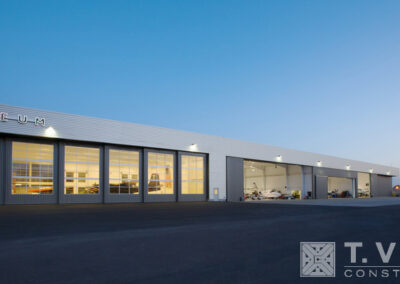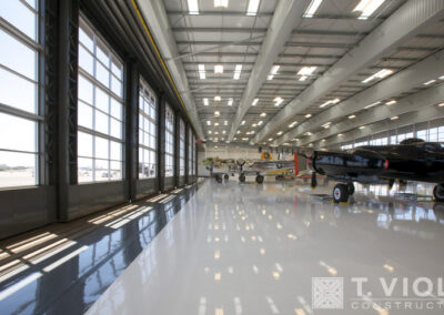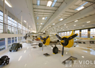 Retrofit and unification of approximately 30,000 sq. ft. of existing hangar/shop/office space built in 1970s and 80s with a 29,800 sq. ft. pre-engineered hangar and office building. This facility houses a private and notably rare collection of WW II aircraft. Features of the new construction include a 260 ft. clear span structure with a 28 ft. high hangar door comprised of ten full-floating glazed leaves that create a 220 ft. wide opening. A structurally supported observation walkway along one side overlooks the aircraft collection below. In addition, 2,400 sq. ft. of conventionally framed two-story offices were incorporated into the overall footprint. Butler Manufacturing supplied the custom-engineered structural system while the architectural horizontal rib metal wall panels were supplied from a local siding supplier.