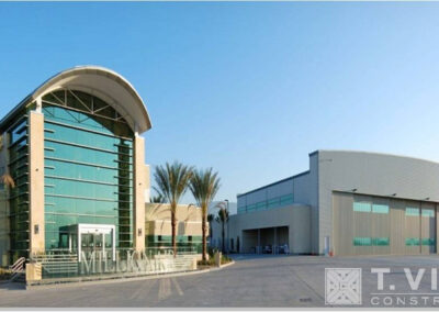 A 45,000 sq ft. corporate hangar and 13,000 sq. ft. office building. This project won the 2008 Project of the Year Award from the Southern California Development Forum. This Butler Steel structure was designed to reflect the sky and stands out as a landmark at the Van Nuys Airport.