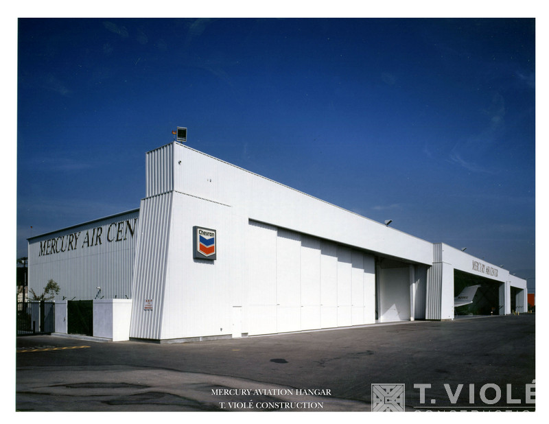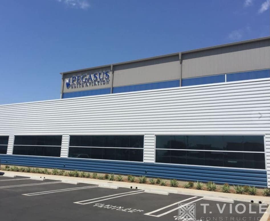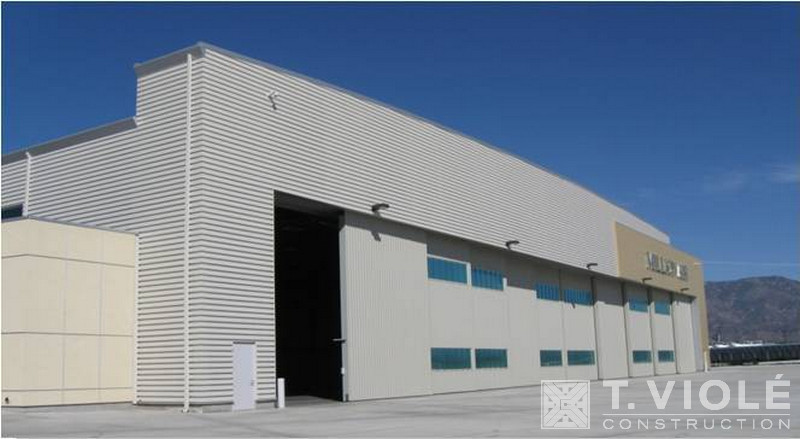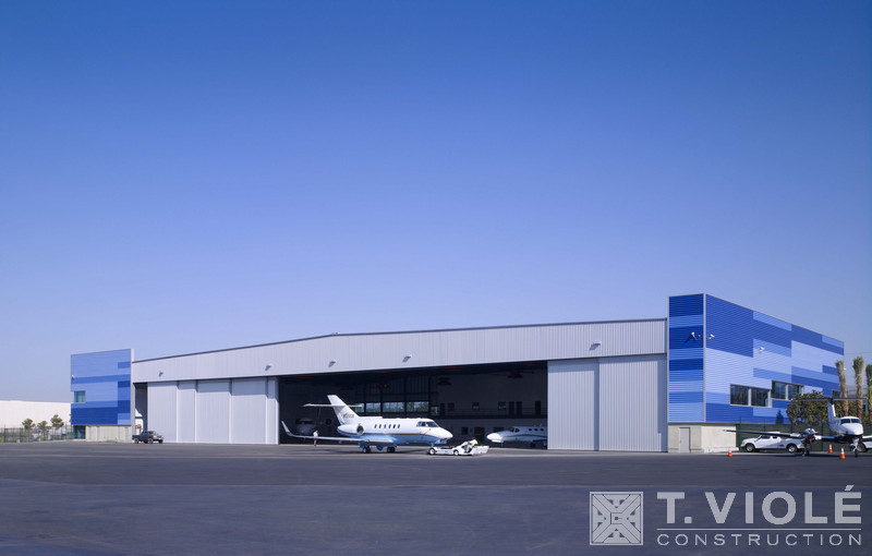A 45,000 sq ft. corporate hangar and 13,000 sq. ft. office building. This project won the 2008 Project of the Year Award from the Southern California Development Forum. This Butler Steel structure was designed to reflect the sky and stands out as a landmark at the Van Nuys Airport.