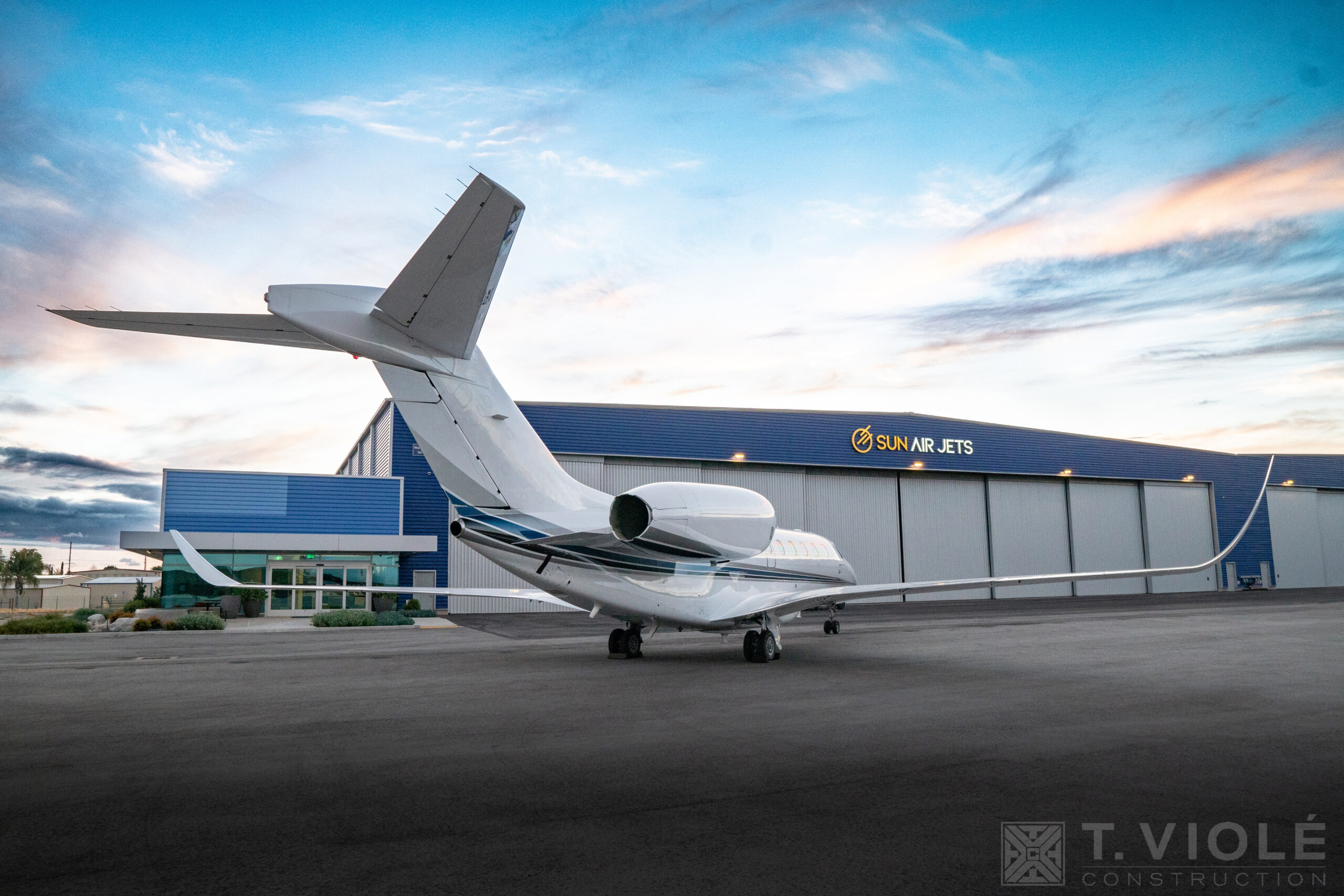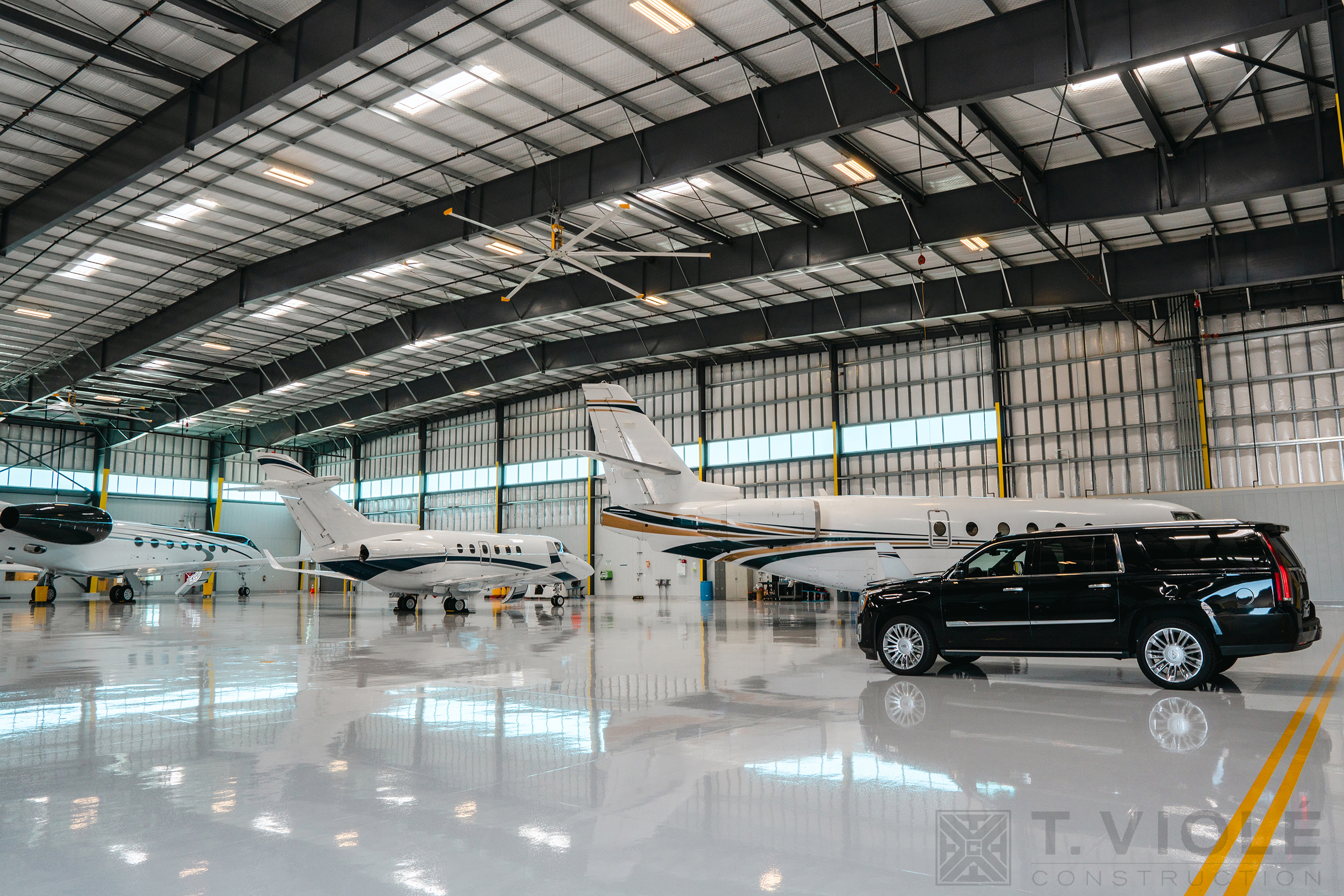 A 5-corporate aircraft hangar complex totaling 120,000 sq. ft. with clear span openings ranging from 160′ to 230′ and full floating hangar doors. A cool roof system includes accommodations for Photovoltaic System.
