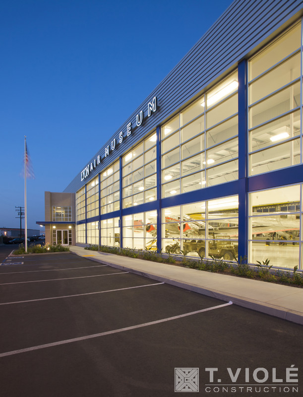 Retrofit and unification of approximately 30,000 sq. ft. of existing hangar/shop/office space built in 1970s and 80s with a 29,800 sq. ft. pre-engineered hangar and office building. This facility houses a private and notably rare collection of WW II aircraft. Features of the new construction include a 260 ft. clear span structure with a 28 ft. high hangar door comprised of ten full-floating glazed leaves that create a 220 ft. wide opening. A structurally supported observation walkway along one side overlooks the aircraft collection below. In addition, 2,400 sq. ft. of conventionally framed two-story offices were incorporated into the overall footprint. Butler Manufacturing supplied the custom-engineered structural system while the architectural horizontal rib metal wall panels were supplied from a local siding supplier.